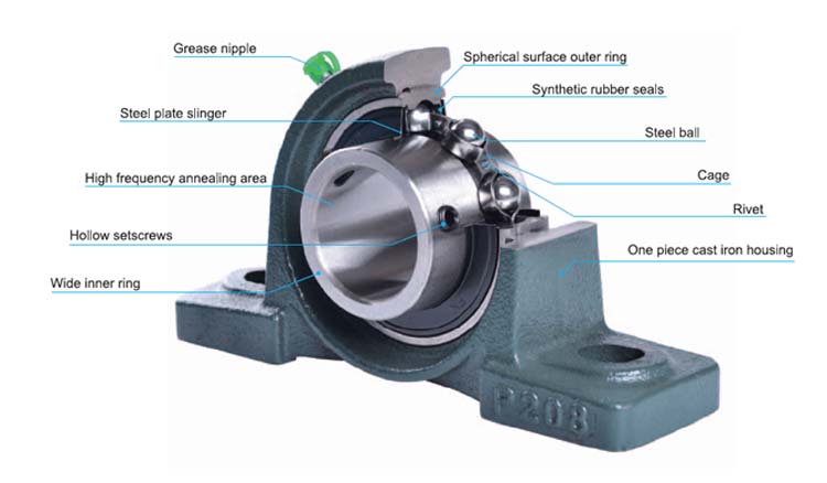 இந்த அலகுகள் ஒரு ரேடியல் பந்து தாங்கு உருளைகள், முத்திரை மற்றும் உயர் தர வார்ப்பிரும்பு அல்லது அழுத்தப்பட்ட எஃகு வீட்டுவசதி ஆகியவற்றின் கலவையாகும். பொருந்தக்கூடிய தாங்கியின் வெளிப்புற மேற்பரப்பு மற்றும் வீட்டுவசதிகளின் உள் மேற்பரப்பு கோளமானது, இதனால் அலகு சுயமாக சீரமைப்பதாகும்.
